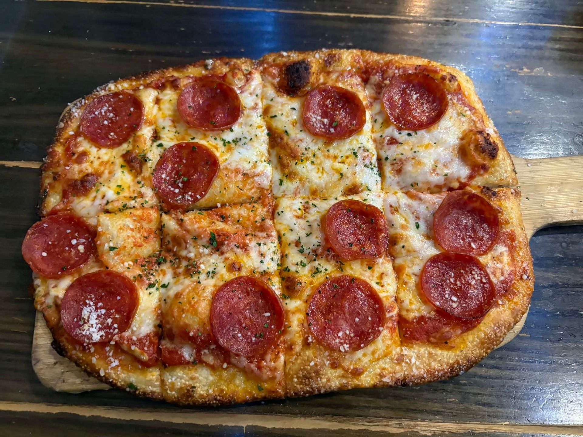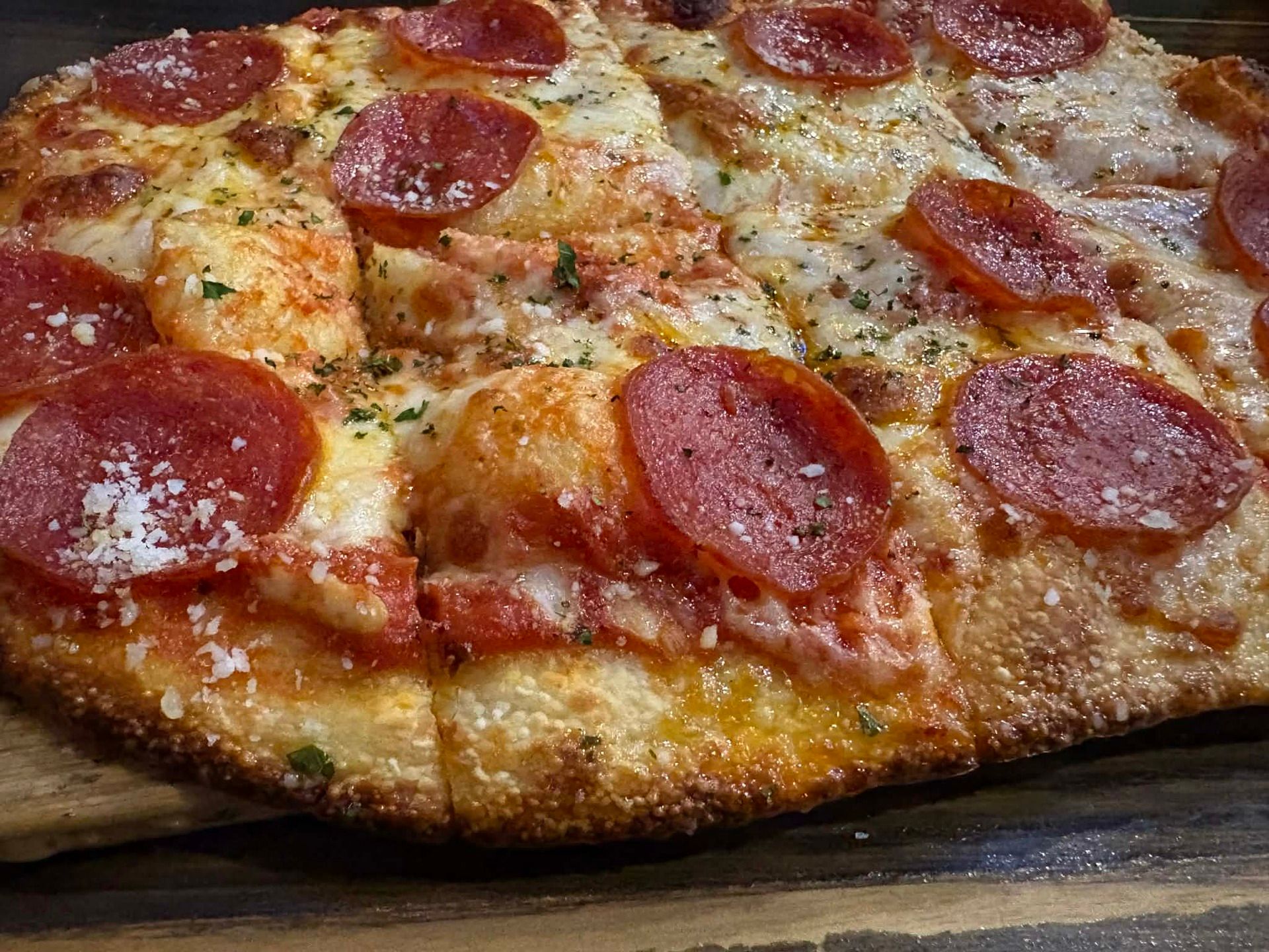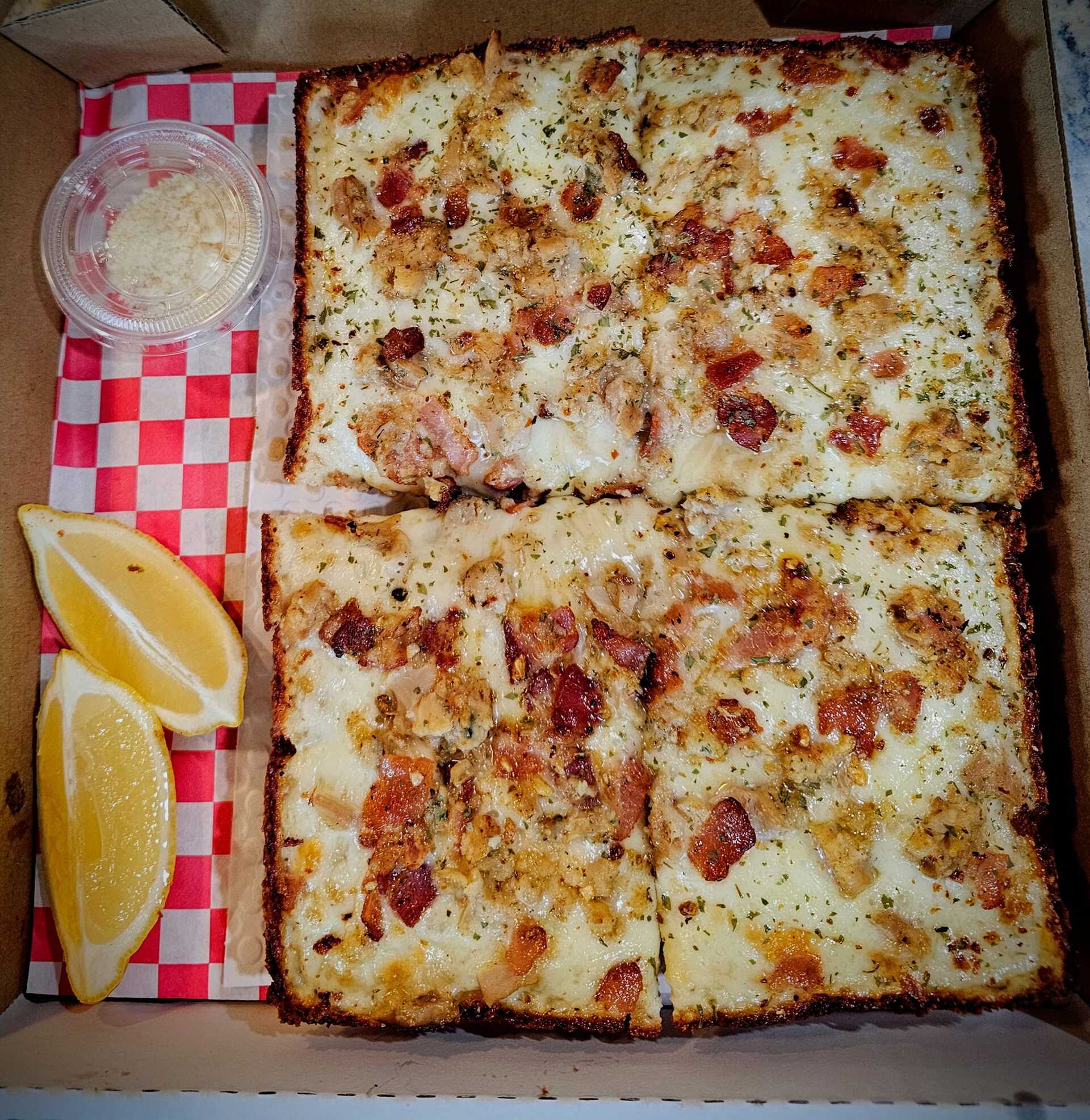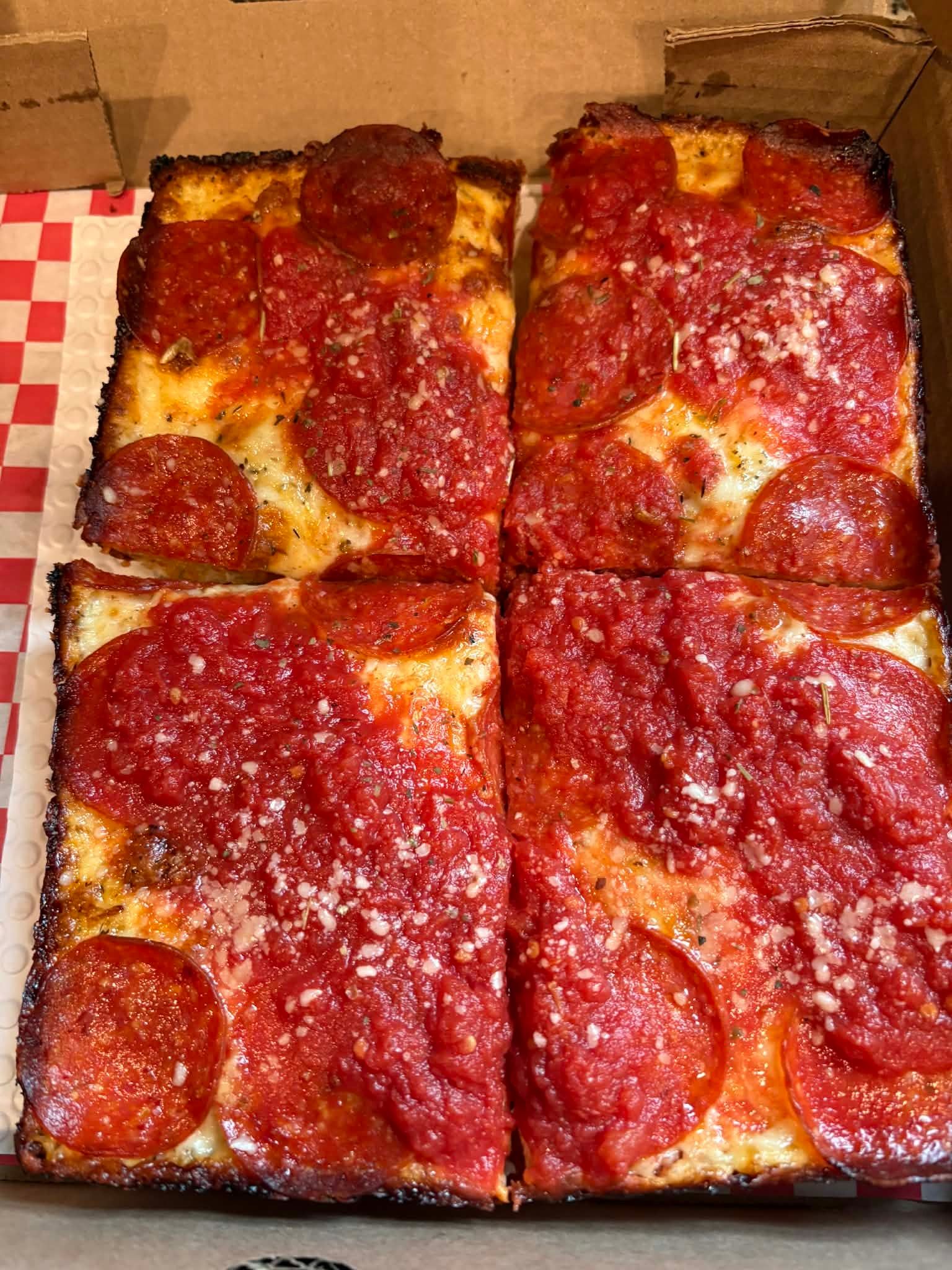Pizza Squared is Detroit-style pizza, and that alone makes it stand out on the Grand Strand. For anyone unfamiliar, Detroit style is a thick, rectangular pizza baked in a deep steel pan, with a light, airy interior, a crispy, almost fried edge, and cheese that goes all the way to the sides to create that signature caramelized crust. Sauce is typically spooned on top rather than buried underneath.