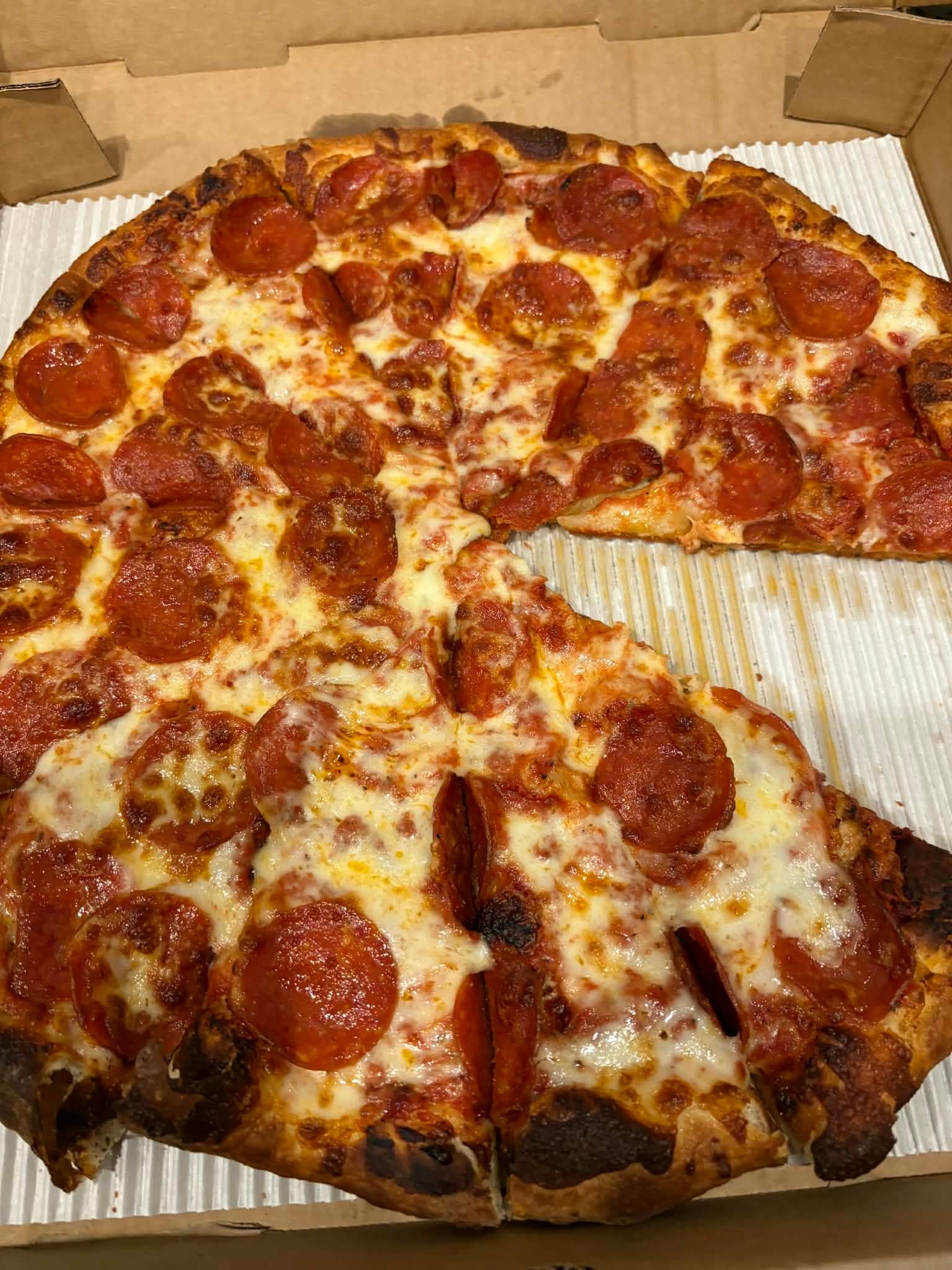 Casa Mia’s is better known around here for its crab cakes and sit-down Italian dishes, so the pizza almost feels like a bonus. They’re doing a Neapolitan-style pie out of a large brick oven, and the flavors themselves are solid. The pepperoni and cheese both came through nicely. For my taste, the pizza was cooked a little more than I’d prefer, and it leaned a bit greasy — though that may just be part of the style rather than a flaw.